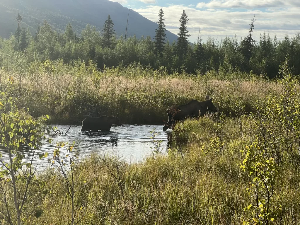 On the way out we made a quick stop by the ERNC boardwalk to catch a view of the valley. We were greeted by a perfect scene – a mama moose and calf up close with a tranquil sunset beyond. This was Christian’s first moose encounter.